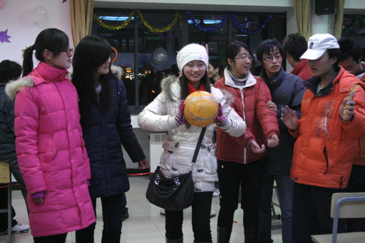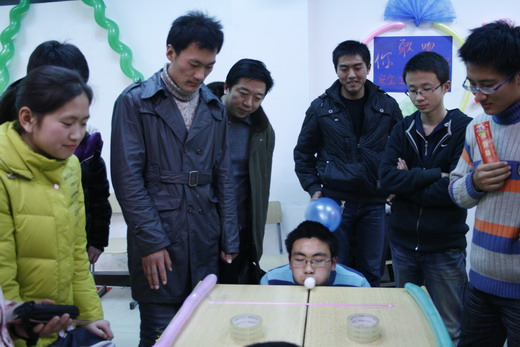 在元旦游艺宫中筹备了“脚下出‘踩’”、“水上浮针”、“一拍定天下”、“极速运球”等等一系列的游戏。“水上浮针”要求同学利用水的表面张力将针浮在水面上,但不幸的是,好多同学的针刚接触到水面就下沉了;“极速运球”需要同学们用筷子夹着乒乓球把它放到另一端的杯子里,虽然难度有点高,仍有很多同学顺利过关,荣获奖券;“一拍定天下”则要求用网球拍正反面反复击拍乒乓球……同学在玩游戏的过程中,相互鼓励,组织者也不时说些幽默的话语逗得大家开怀大笑。教室里大家的欢声笑语融成一片,彰显出元旦的轻松欢乐气氛。