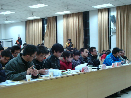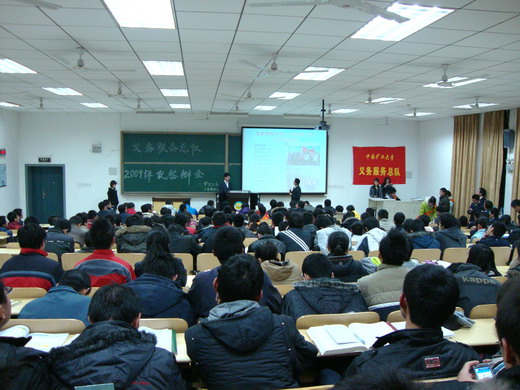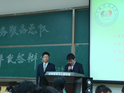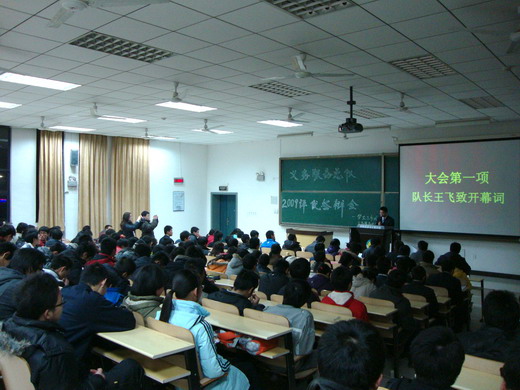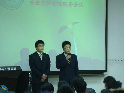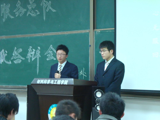 大会首先由义务服务总队队长王飞致开幕词,王飞简要介绍了学生义务服务中心的概念、职能及服务宗旨,概要说明各分队的经验与不足,定位了今后服务中心的发展方向。然后大会进入评优答辩环节,答辩分为自我陈述与答老师提问两部分。文法、管理、材料等16个学院依次对各自的服务分队进行介绍。