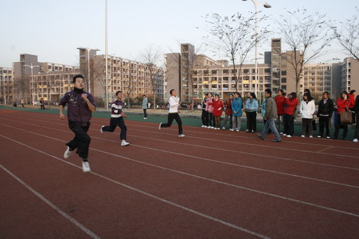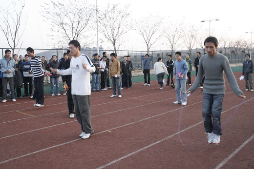 参加本次趣味运动会的宿舍共有25个,分成9个小组,每一组由4名同学组成。每个参赛小组的首先进行的环节氏男生100米、女生50米短跑,紧接着由第二名同学连续跳绳20次,之后第三名同学迅速连踢10个毽子。只见踢完毽子的同学抱起篮球就飞奔向篮球场,比赛进入最后一个环节投球比赛:男生站在罚球线处可累计进球5次,女生在任一位置处投篮进框3次。整个接力赛程中用时最少的队伍即为获胜者。赛场上每位参赛同学都竭尽全力,他们风一般的速度、灵巧的身姿、娴熟的技艺不禁让大家惊叹。