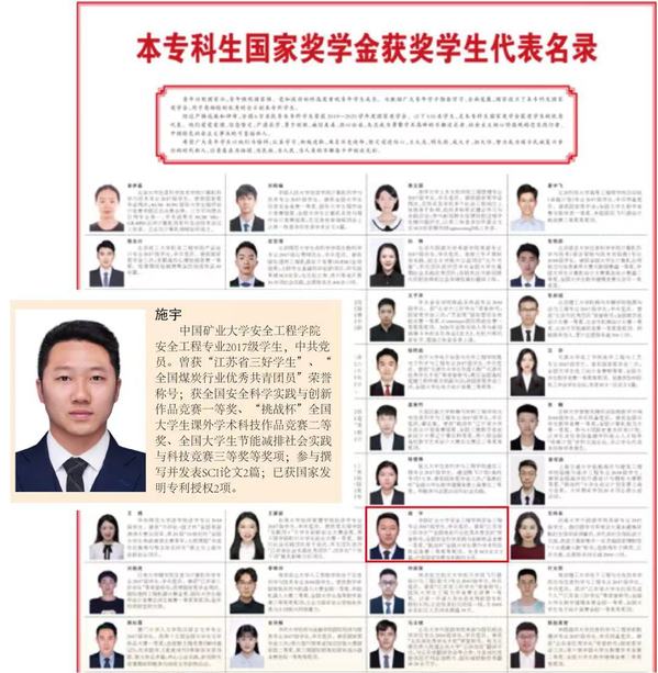 安全工程专业2017级国际班学生,中共党员。曾获国家奖学金、徐矿集团奖学金、江苏省三好学生、全国煤炭行业优秀共青团员等荣誉,获全国安全科学实践与创新作品竞赛一等奖、“挑战杯”全国大学生课外学术科技作品竞赛二等奖、全国大学生节能减排社会实践与科技竞赛三等奖等奖项,授权国家发明专利2项。现已直博我校安全科学与工程专业。