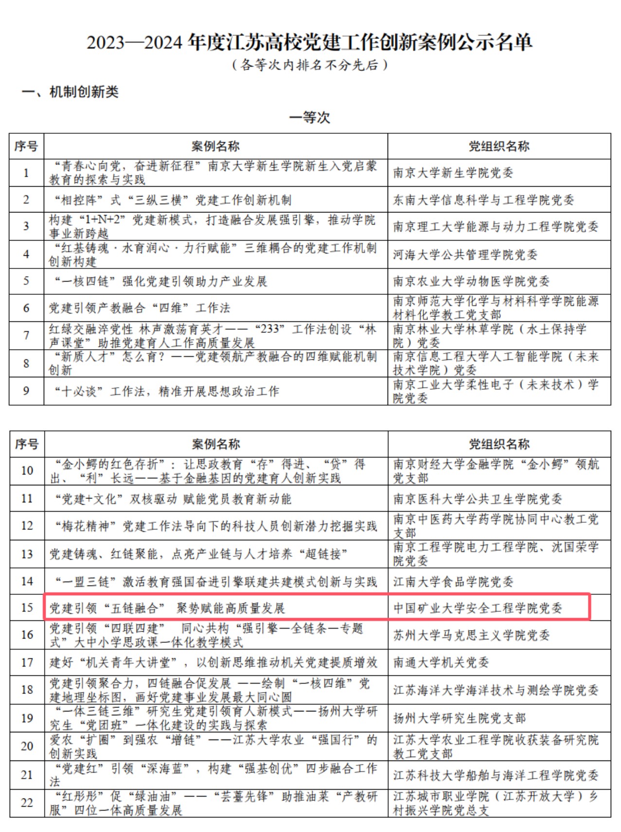 日前,江苏省委教育工委公布了2023—2024年度江苏高校党建工作创新案例名单,学院党委上报的《党建引领“五链融合”聚势赋能高质量发展》荣获机制创新类案例一等次。