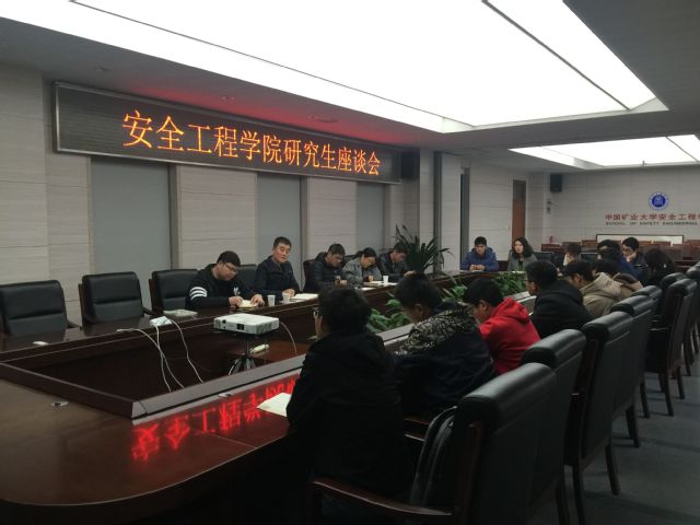 11月29日下午,安全学院在读研究生座谈会在矿科A412召开,学院党委副书记钱雄、学工办主任于基伯、科研办主任程婷婷出席了座谈会。15名博士、硕士研究生代表参加了座谈。钱雄副书记总结了近期学院在教学科研、学科建设、人才培养上取得的成绩,鼓励研究生同学们为学院的本科教学发展及本科生人才培养提出意见和建议。同学们积极发言,会上,学院领导和老师还与研究生同学们讨论了研究生学生工作的等其它意见和建议。