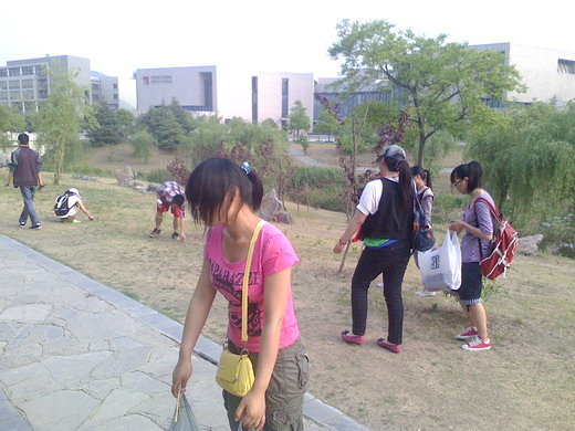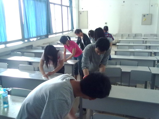 负责宣传和考核的人员在文法学院楼会合。这次活动分为两个部分——擦掉自习室桌子上的字迹和污垢;到矿大北门捡竹签和垃圾。班级同学也相应的分为了两组。