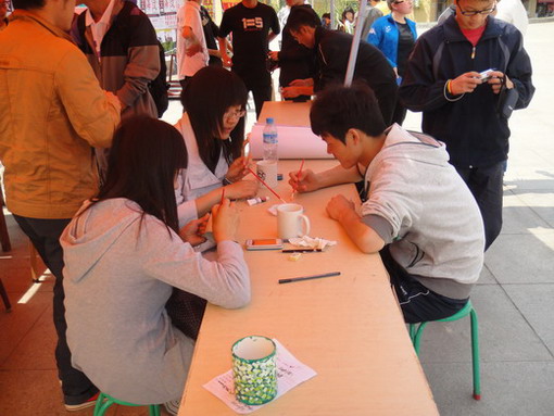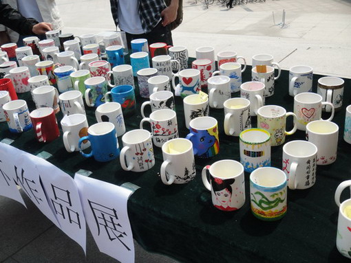 与矿业、信电、化工、环测、理学院、外文、计算机、艺术学院的团委学生会宣传部联合举办的手绘马克杯大赛现场组比赛和非现场组的作品投票活动在二食堂广场顺利开展。
