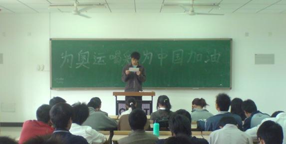 为响应学校号召,体现广大同学的爱国精神,4月23日下午4:00,安全学院安全06-1班在教五A203召开了“为奥运加油 为中国喝彩”主题班会。安全06-1班的全体同学参加了此次班会,团支书王伟杰同学主持班会。