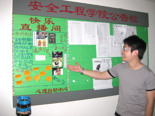 心理自助中心创办的“快乐直播间”在学院宿舍楼宣传栏上隆重登场,快乐出击。