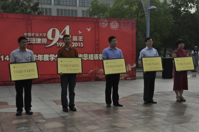 在升国旗奏国歌、校歌后,学生党员代表用诗朗诵为建党94周年献词。随后,党校专职副校长、组织部副部长胡琼宣读了表彰决定。安全学院“一人一本,分享人文”教师捐书助学党日活动获得“2014年度江苏高校最佳党日活动”优胜奖,学院获得“2014年度学生党建工作先进学院”称号;安全学院煤矿瓦斯治理研究所第二党支部荣获“红旗学生党支部”称号;陆新晓同学荣获“优秀学生党员标兵”称号,史波波、沈一丁、张鑫、古稀等四名同学荣获“优秀学生党员”称号。