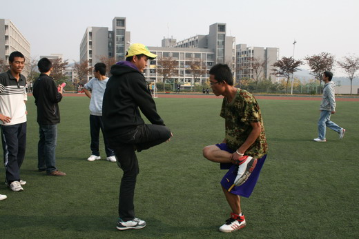 参加趣味活动的同学准时来到第三田径场,很快便以高昂的热情投入到训练之中。训练包括“抱腿跑”、“众人一条肩”和“脚斗”。在“抱腿跑”的训练中,每位同学都积极配合,努力地跟上集体的步伐。在“众人一条肩”的训练中,同学们更是以高度的默契投入到训练之中。操场上嘹亮的口号声震撼着同学们的心灵,让大家深深感受到集体的力量。在“脚斗”的训练中,双方相互对峙,斗得异常激烈。同学们都全身心地投入到训练中,合作能力有了进一步提升。