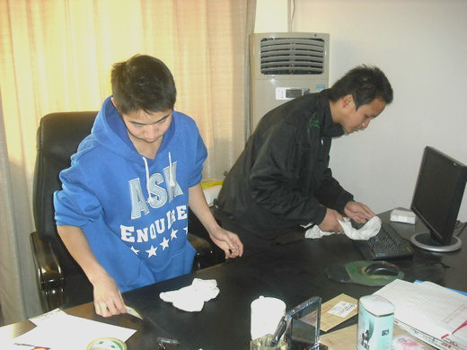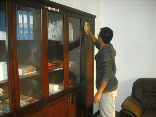 办公楼。组长周红振和罗叶波简单的工作安排后,20余名服务分队成员两三个人一组,分散到十余个办公室。你擦桌子,我扫垃圾,大家立刻热火朝天的忙了起来。活动中,队员们一丝不苟地清扫着地面,包括每一个角落和每一处容易被忽视的地方。接着,队员们又将凌乱的桌椅摆放整齐,将办公桌上杂乱的文件和书籍归类整理。队员们不怕脏不怕累,彻底清扫卫生死角,将服务分队的奉献精神表现得淋漓尽致。安全10-3班的罗剑飞同学一直干得特别起劲,挥着一双还来不及洗的手兴奋地说:“感恩节刚刚过去,总想为老师们做些什么。像今天这样,为老师做点实事,是最有意义的!”在队员们一个多小时的努力下,办公室和会议室的面貌焕然一新,窗明几净。