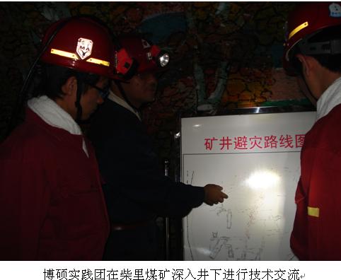 开始正式进行社会实践,在科技服务的社会实践中,实践团受到了新安煤矿、柴里煤矿和田陈煤矿的热烈欢迎。每到一个矿,大家都与煤矿生产技术负责人总工程师进行了科技技术座谈交流会;之后在每个煤矿都举行了一次关于煤矿“安全开采,一通三防”方面的技术讲座;并在技术副总的陪同下参观了一些比较有特色的加工厂如新安煤矿的洗煤厂等,同时,博硕团成员深入井下针对具体问题当场分析,同时提出在技术方面的看法。在考察过程中,煤矿相关负责人把企业的基本运行情况向实践团成员进行了简单的介绍,同时博硕团成员根据煤矿领导和技术人员提出的难题,结合自己所学专业知识同企业相关人员进行了技术服务,科技攻关等方面的讨论。