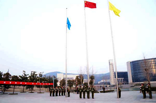 早上7时,庄严的仪仗队护卫着国旗走入场内。英姿飒爽的国旗护卫队的队员们迈着整齐的步伐,护送国旗入场。伴着庄严嘹亮的国歌,五星红旗冉冉升起。随后,韩国三级