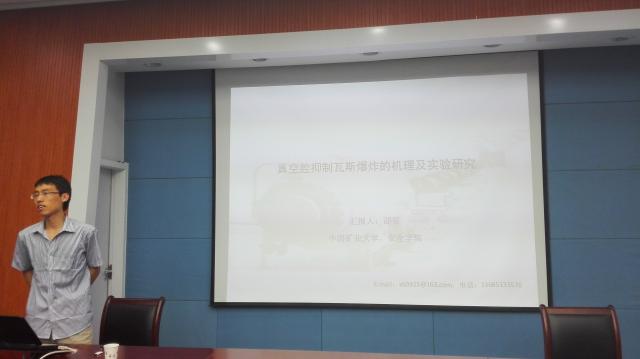 报告首先通过近几年典型的特大事故强调了爆炸尤其是矿井瓦斯爆炸的严重性,为介绍瓦斯爆炸防治的技术及方法埋下伏笔。在瓦斯爆炸防控技术方面,邵昊博士重点讲解了真空腔抑制瓦斯爆炸的机理以及实验的操作过程,通过接入真空腔和未接入真空腔两组实验对比直观地展示了真空腔抑制瓦斯爆炸的良好效果。然后分别从瓦斯的爆炸强度,真空腔的结构、体积及抑爆位置等不同因素的影响具体剖析了真空腔抑制瓦斯爆炸的不同效果。最后,与会学生和邵昊老师进行了互动。