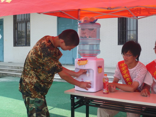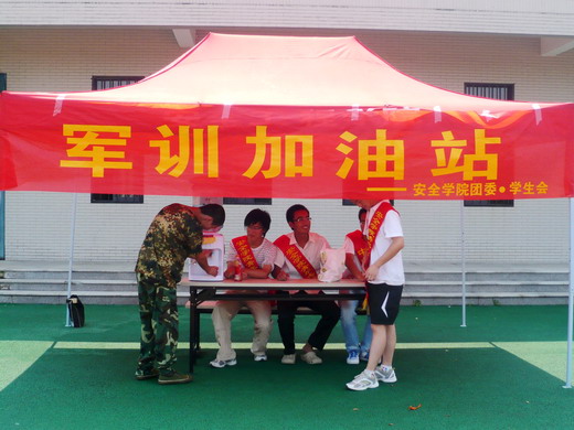 团委学生会特在第三田径场设立了“安全学院军训加油站”为10级新生军训提供便利。