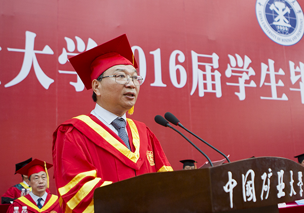 葛世荣校长发表了讲话。他说,对于学生而言,矿大不一定是最向往的,但一定是最难忘的;矿大不一定是最满意的,但一定是最关键的;矿大不一定是知名度最高的,但一定是最努力的。他大量列举了今年的优秀毕业生,并坦诚地表示,与同学期望和愿景相比,矿大的培养质量还存在着不小的差距,要把同学们的满意作为鼓励,继续保持下去,要把同学们的不满意作为鞭策,及时改进完善,努力创办世界第一的矿业大学。学生即将离开母校,游学四海,建树八方,葛世荣校长还表示,作为师长和朋友,有三句走心的话送给大家,概括为“三个不后悔”,即一是不因青春无为而后悔,二是不因辜负父母而后悔,三是不因淡忘母校而后悔。致辞满含深情、语重心长,不断被毕业生热烈的掌声、欢呼声打断。