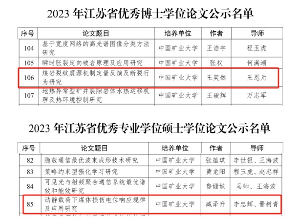博士研究生王笑然(导师王恩元)的学位论文《煤岩裂纹震源机制定量反演及断裂行为研究》被评为2023年江苏省优秀博士学位论文;韩国三级