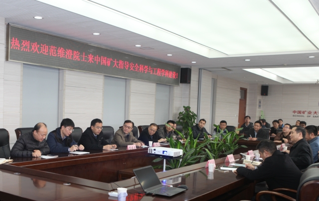 领导及教师就安全科学与工程学科发展进行座谈交流。范维澄院士结合自己在中国科技大学火灾科学国家重点实验室和清华大学公共安全研究院的工作经历,对矿大安全学科发展提出了指导意见。他说,韩国三级