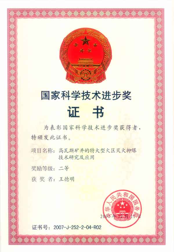 院长王德明教授与周福宝副教授、秦波涛副教授等共同完成的“高瓦斯矿井的特大型火区灭火抑爆技术研究及应用”荣获2007年度国家科学技术进步奖二等奖,这是我校安全技术及工程国家重点学科收获的又一项重大科技成果。该项目以宁夏白芨沟矿特大型火区的治理为切入点,创建了远距离水封进风侧低位巷道的抑爆技术;首创三相泡沫灭火抑爆新技术;集成创新了高瓦斯封闭区域启封的锁风注氮、逐段解封、氮气喷雾降温、均压启封等成套实用技术。项目成果先后在宁夏、河南、辽宁、陕西、安徽、新疆、贵州、孟加拉国等60多个矿井获得应用,及时扑灭了火灾或消除了隐患,确保了矿井的安全生产。项目的实施提高了矿井灾变处理的技术水平,最大限度地减少了人员伤亡和财产损失,为实现煤矿安全综合治理、标本兼治提供了科技支撑,推动了煤炭行业的科技进步,取得了显著的社会效益。