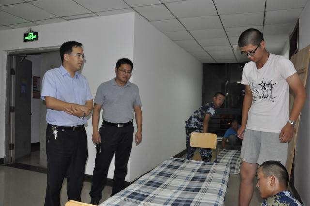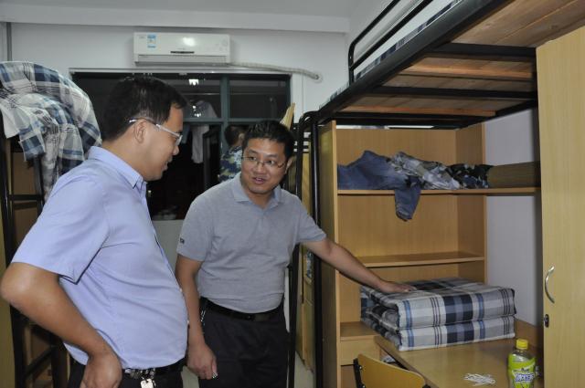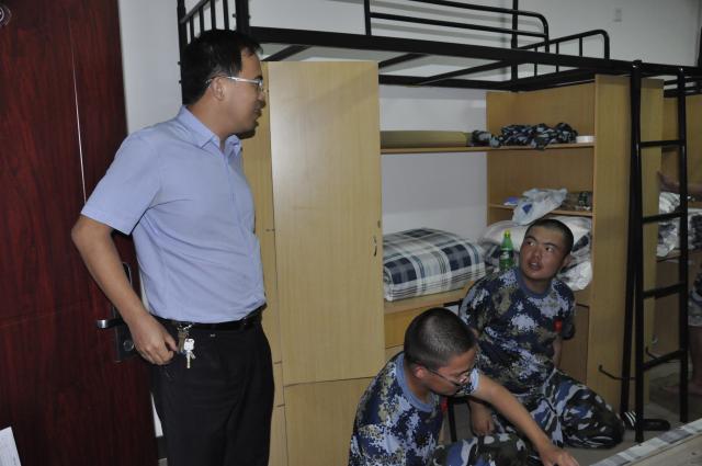 院长周福宝、党委副书记钱雄、辅导员孙留涛前往梅三楼学生宿舍,看望2015级新生,视察军训内务整理。