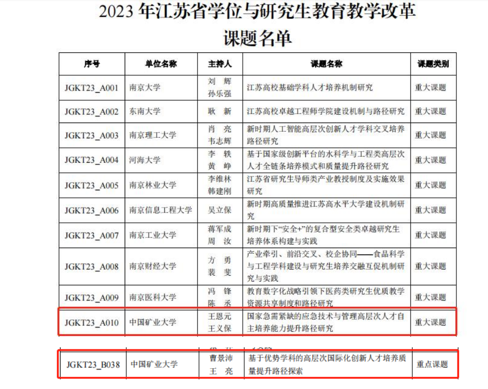 院长王恩元教授和应急管理学院院长王义保教授主持的《国家急需紧缺的应急技术与管理高层人才资助培养能力提升路径研究》项目获批重大课题立项;化工学院副院长曹景沛教授和韩国三级