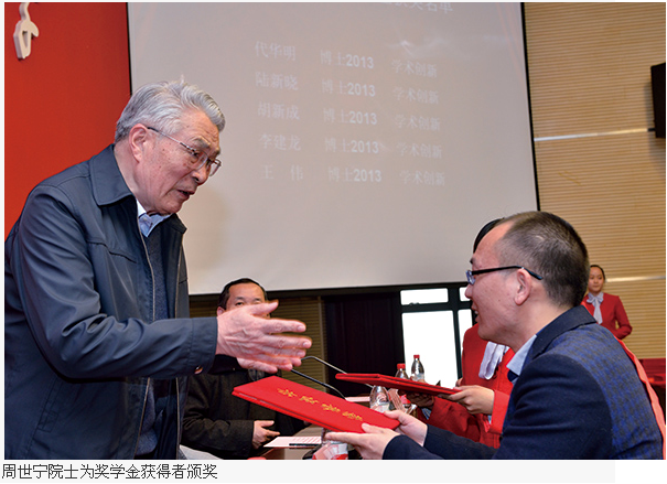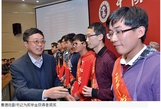 “瓦斯-好学”奖学金是由中国工程院院士袁亮捐资设立,周世宁院士和袁亮院士担任指导委员会名誉主任,校长葛世荣担任指导委员会主任并纳入学校管理的一种专项奖学金。本届“瓦斯-好学”奖学金经过学生申请、评选委员会评选以及公示等程序,共有11名同学获得学业成绩优秀奖学金,9名同学获得学术创新成果突出奖学金。周世宁院士、袁亮院士,曹德欣副书记分别为“学术创新奖学金”获得者和“学业优秀奖学金”获得者颁奖。