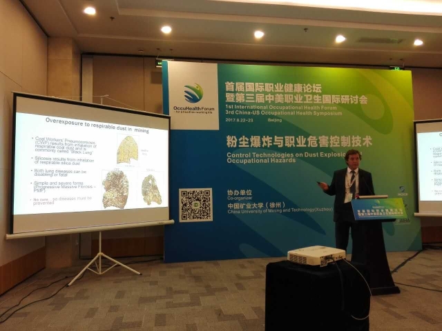 院长周福宝教授主持,来自中国、美国、德国等国家的专家参加本次论坛报告与研讨。论坛分别就新型干式过滤降尘技术、持续性个体粉尘监测仪、除尘滤料的发展、露天矿运输扬尘流场模拟、金属矿山井下粉尘污染控制、国内外呼吸防护装备标准体系、粉尘防爆领域的管理及标准、焊接作业的呼吸防护、爆炸性粉尘环境中呼吸性粉尘的防护、粉尘爆炸预防等议题做了主题报告与深入讨论。与会代表一致认为,粉尘的危害既要关注有爆炸性粉尘的爆炸危害,更要持续关注粉尘对广大职业工人所造成的健康危害。本次国际论坛报告展现了众多新技术,其中,由韩国三级