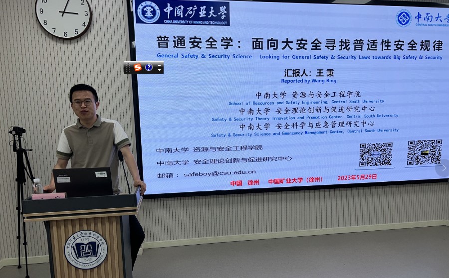 5月29日下午,中南大学王秉教授作题为“面向大安全寻找普适性安全规律”的报告,报告由安全学院院长王恩元教授主持。