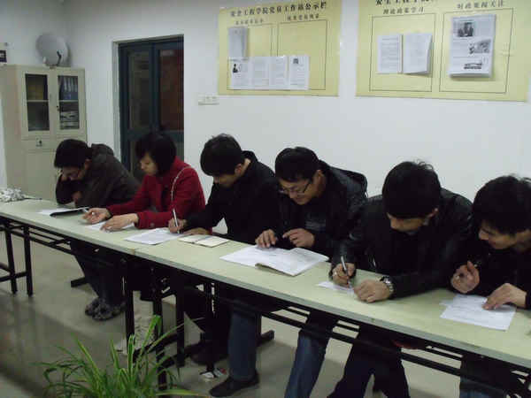在两场测评会上,安全08-3班党支部书记蒋雨辰和安全09-4班党支部书记王旭东向参加测评人员陈述了本支部近一年来开展创先争优活动及日常工作的情况。参与测评人员在听过汇报之后,认真地在统一制作的测评表上填写了测评意见。刘静老师根据学院党委的委派,主持了两场测评会并发放和收回了测评表。