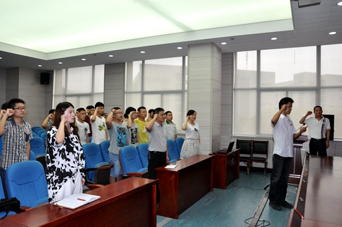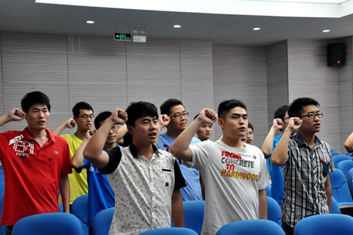 首先,孙留涛老师向党员同学们介绍了入党宣誓仪式的重要意义,指出举行入党宣誓仪式一方面是党对党员的基本要求,另一方面是党员对党表示自己愿意承担的政治责任,对党的坚定信念和为党的事业奋斗终身的决心。接着,在场所有党员面向党旗站立,在领誓人党员工作站站长李先赞同学带领下慷慨激昂地宣读誓词。同学们真诚、恳切、坚定的话语在活动室内响起。新的学生党员在誓言中感受到了入党的神圣和自己肩上的重任。接着,10级级朱云飞同学作为学生党员代表发言,他在发言中倡议所有学生党员要不断加强党性修养,端正学习态度,明确学习目标,积极参加学院和学校组织开展的各类活动,配合学校、学院学生工作的开展,并且要注重个人素质和修养。