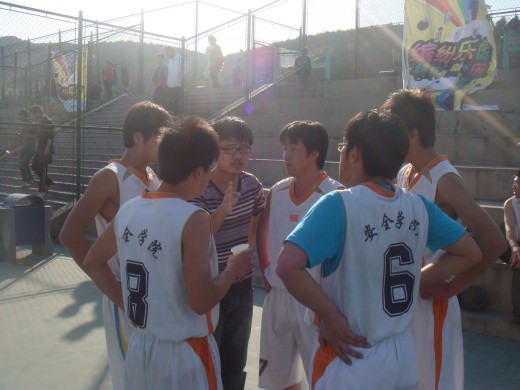 随着第三节的开始,比赛进入了白热化,全场观众都紧绷着弦。观众的呐喊助威更是此起彼伏。双方队员都开始了积极的拼抢,我方凭着高昂的的斗志和饱满的激情连突带投,快速进攻连进两球将比分拉开,而文法学院的队员也不甘示弱,毫不逊色,加紧防守,追平比分。场边的观众看的大呼过瘾,如潮的喝彩声使全场热情高涨。正所谓棋逢对手,实力相当,双方的比分一直紧咬着,胶着着,你追我赶,反超被超,激烈进行。再距第三节比赛还有一分钟时对方队员试图高抛命中三分,但最终未能如愿。最后韩国三级
