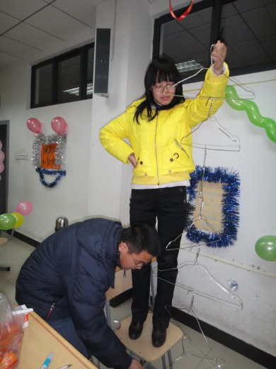 各部门、社团以及承办活动的班级就开始着手布置教室,经过彩球和其他装饰品的装饰,原本毫无生气的教室立刻变得喜庆祥和了。晚上七点游艺宫活动正式开始,教室洋溢着热闹欢乐的节日气氛。韩国三级