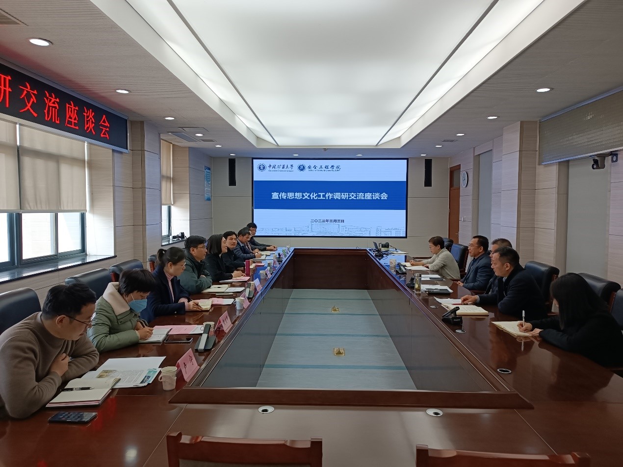 3月3日上午,校党委宣传部部长陈文一行来院调研指导宣传思想文化建设工作,学院在矿科A412会议室举行座谈会。院长王恩元、院党委书记曲颂、副院长郭梅香、院党委副书记孙留涛等参加了座谈会。会议由曲颂书记主持。
