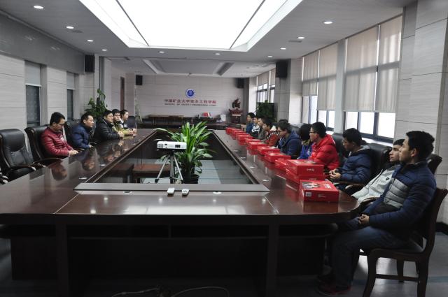 在矿业科学中心A412举行了寒衣发放仪式。安全学院党委副书记钱雄,辅导员孙留涛、郑文奇、吴张蔚和何伟民老师与部分安全新生参加了本次仪式。