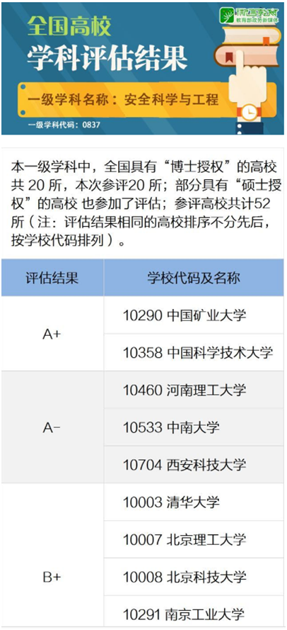 “安全科学与工程”一级学科继2012年全国排名第一以后,再次被评为A+(最高档)学科。本次学科评估“安全科学与工程”一级学科全国共有52所高校参评(比上一轮增加31所高校),其中具有博士学位授权高校20所,具有硕士学位授权高校32所。