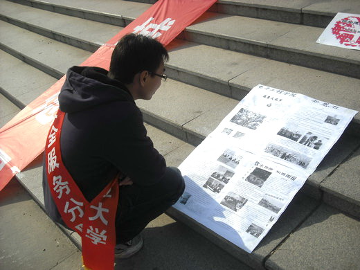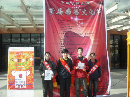大学生服务分队的队员们10点就到了二食堂广场装饰场地。广场的阶梯上两条平行横幅围成一条“感恩之路”,向同学们宣传感恩文化、展示感恩的图片。同时,感恩文化节系列活动之“骑车献爱心”启动仪式同时举行,许多同学在“感恩社会,骑车献爱心”的条幅上签下了自己的名字,表明他们践行感恩之志的决心。现场报名参加感恩活动的同学非常火爆,一些同学积极向总队人员咨询了感恩文化节的系列活动,并表示希望自己能够多参加一些感恩活动。