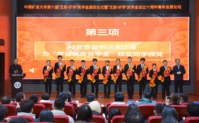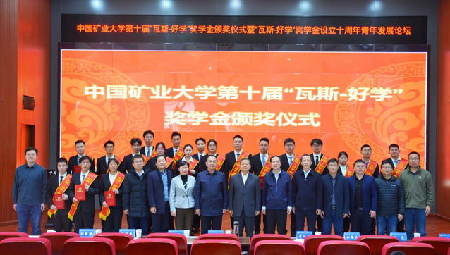 学生工作处处长冯震宣读第十届“瓦斯-好学”奖学金表彰决定。第一届“瓦斯-好学”奖学金获得者代表、国家重大人才工程青年项目入选者安徽理工大学江丙友教授,第九届“瓦斯-好学”奖学金获奖代表、韩国三级