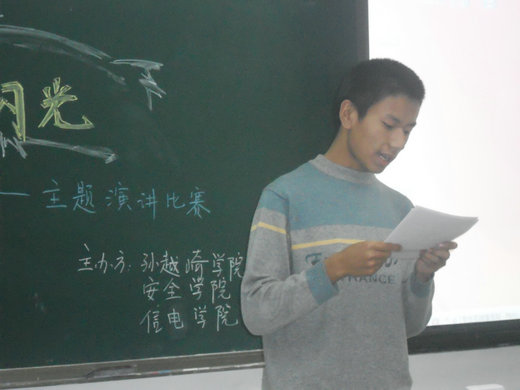 安全10-1班的连强同学站在“把握自己,让青春闪光”的角度,针对大学生所怀抱的梦想与肩负的责任进行了一番探讨。信电学院10-5班的程雪同学从时间和空间角度诠释了青春的内涵,她激情四溢的演讲呼吁大学生抓住天时、地利与人和,让青春在这里腾飞,让青春熠熠生辉。