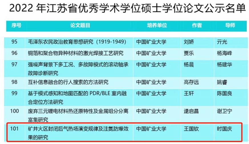 硕士研究生王国钦(导师时国庆)的学位论文《矿井火灾封闭后气热场演变规律及注氮防爆效果的研究》被评为2022年江苏省优秀学术学位硕士学位论文。