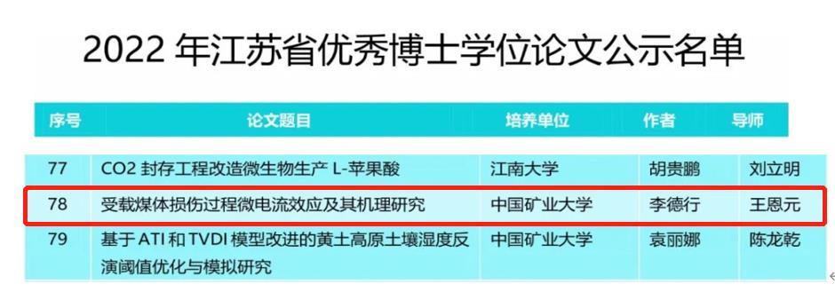 博士研究生李德行(导师王恩元)的学位论文《受载煤体损伤过程微电流效应及其机理研究》被评为2022年江苏省优秀博士学位论文;韩国三级